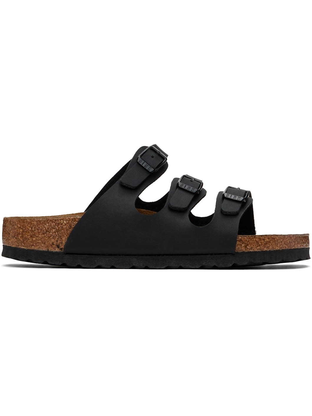 Buffed Birko-Flor® faux-leather slip-on flat sandals in black. · Open toe · Adjustable pin-buckle straps at vamp · Logo embossed at inner side · Cushioned molded suede footbed · Cork-latex midsole · Treaded foam rubber sole · Logo-engraved black hardware Supplier color: Black Upper: synthetic. Sole: rubber. Made in Germany 251513F124035