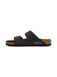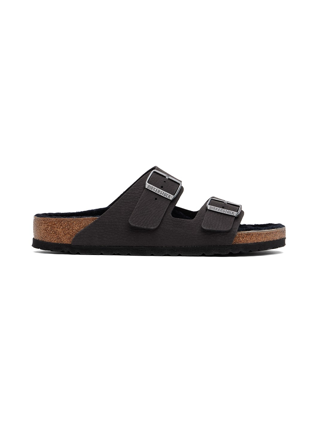 Grained faux-leather slip-on sandals in black. · Open toe · Pin-buckle straps at vamp · Logo embossed at inner side · Logo patch at molded shearling footbed · Cork-latex midsole · Treaded EVA foam rubber sole · Logo-engraved antiqued silver-tone hardware Supplier color: Desert dust black Upper: synthetic. Sole: cork, rubber. Made in Germany 242513M234011