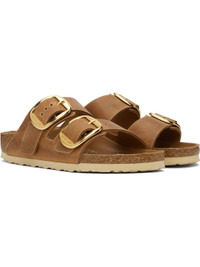 Oiled leather flat sandals in brown. · Open toe · Adjustable pin-buckle straps at vamp · Logo embossed at inner side · Logo printed at molded leather footbed · Cork midsole · Treaded rubber sole · Logo-engraved gold-tone hardware Supplier color: Cognac Upper: leather. Sole: cork, rubber. Made in Germany 251513F124031
