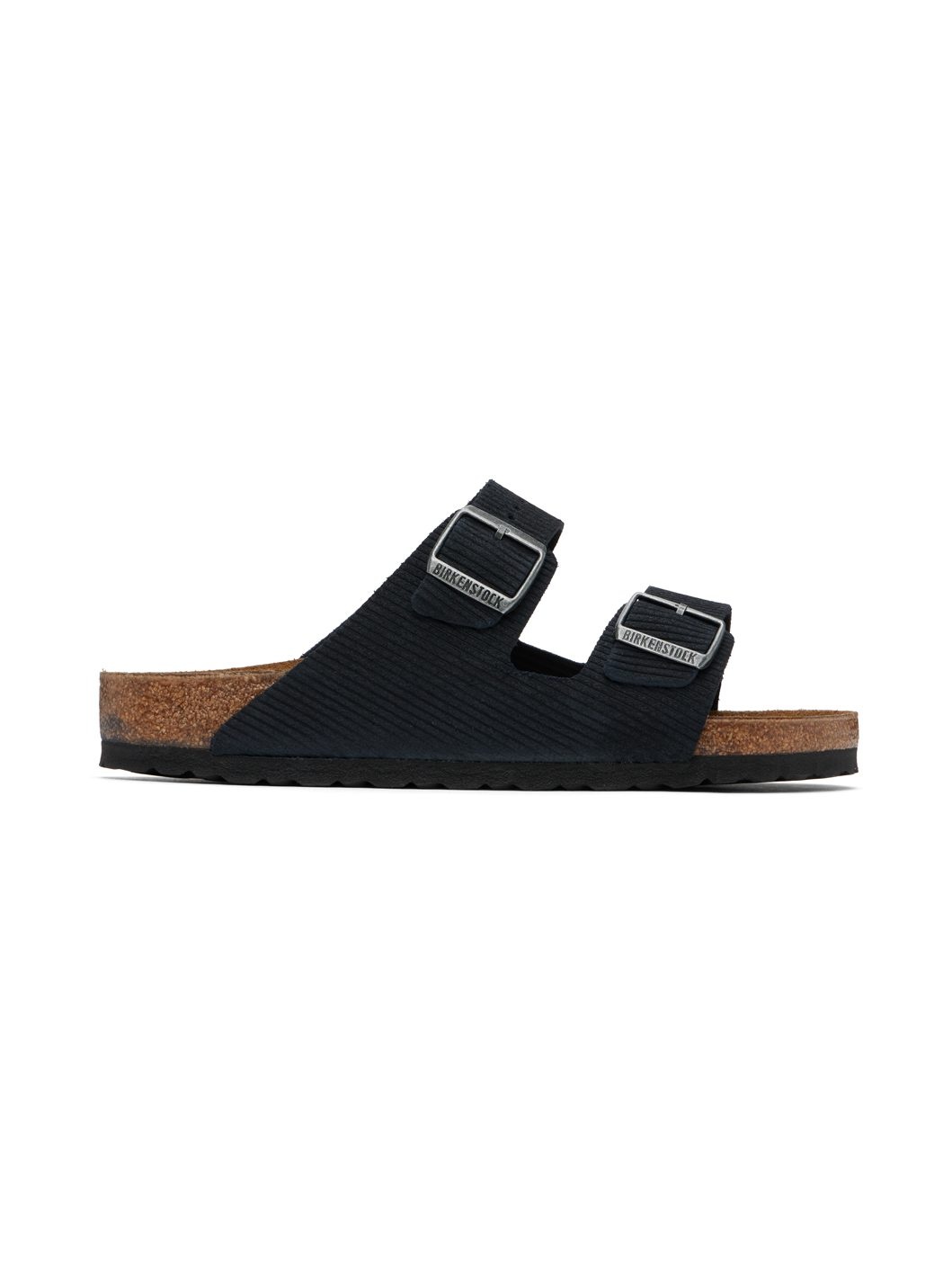 Corduroy-embossed suede slip-on sandals in navy. · Open toe · Adjustable pin-buckle straps at vamp · Logo embossed at inner side · Logo stamp at molded suede footbed · Cork midsole · Treaded EVA rubber sole · Logo-engraved antiqued gold-tone hardware Supplier color: Midnight corduroy Upper: leather. Sole: cork, rubber. Made in Germany 242513M234008