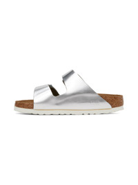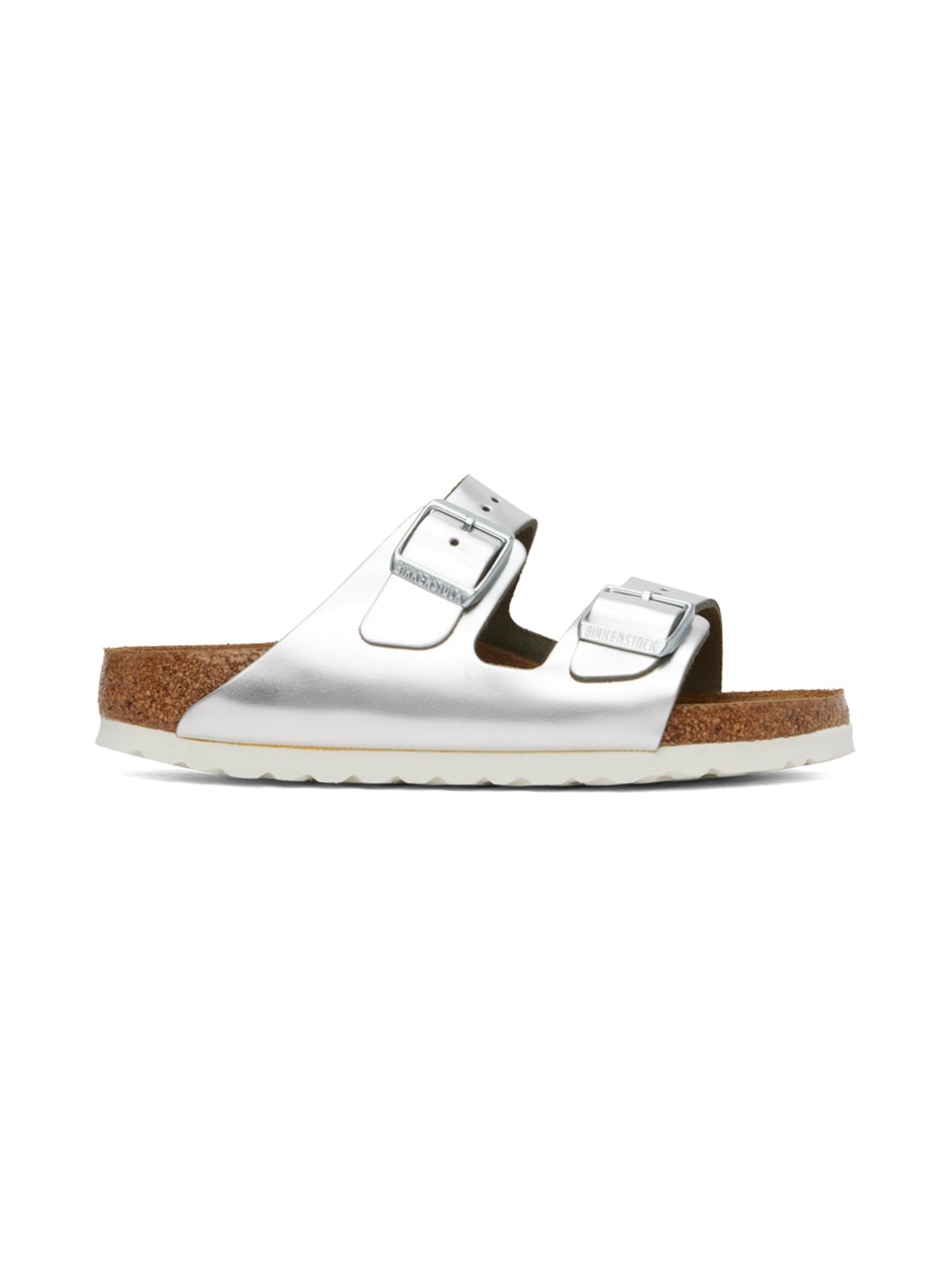 Grained faux-leather slip-on sandals in silver tone. · Open toe · Adjustable pin-buckle straps at vamp · Logo embossed at inner side · Logo stamp at molded suede footbed · Cork midsole · Treaded EVA rubber sole · Logo-engraved silver-tone hardware Supplier color: Metallic silver Upper: synthetic, leather. Sole: cork, rubber. Made in Italy 241513F124048