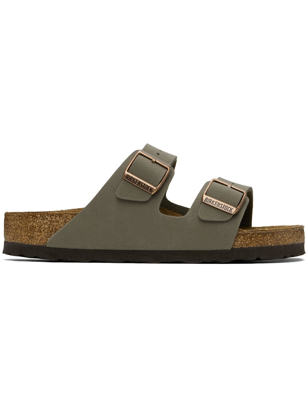 Grained Birkibuc® faux-leather slip-on flat sandals in taupe. · Open toe · Adjustable pin-buckle straps at vamp · Logo embossed at inner side · Logo stamp at molded suede footbed · Latex-cork midsole · Treaded foam rubber sole · Logo-engraved copper-tone hardware Supplier color: Stone Upper: synthetic. Sole: rubber. Made in Germany 251513F124029