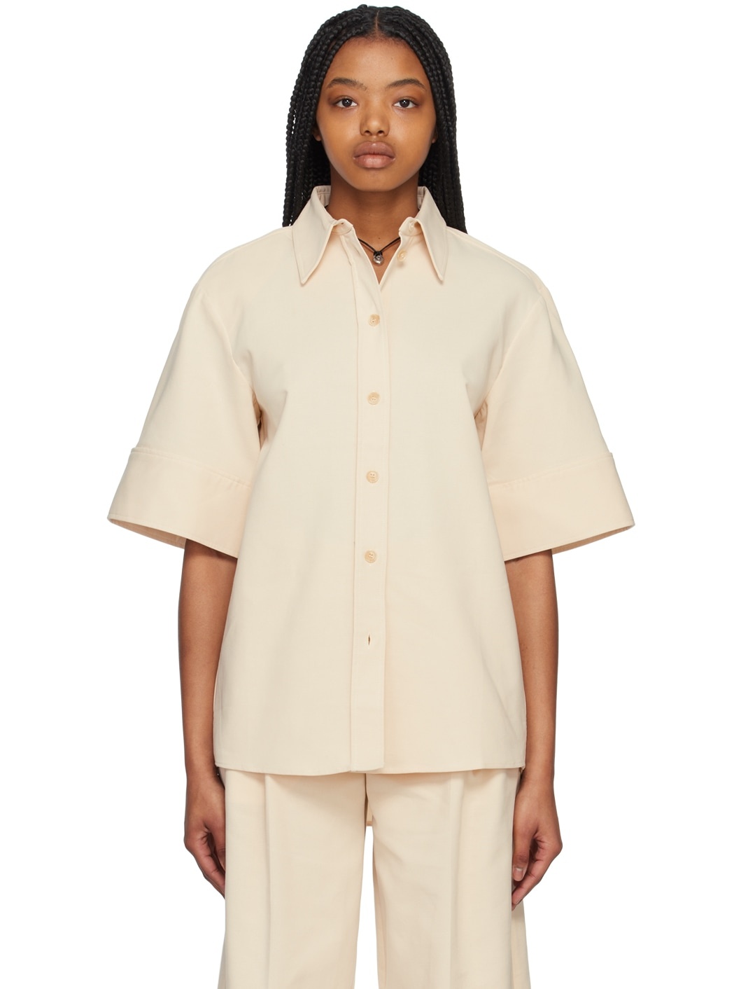 Stretch cotton broadcloth shirt. · Spread collar · Button closure · Shirttail hem · Rolled cuffs · Box pleat at back Supplier color: Parchment 95% cotton, 5% elastane. Made in Portugal 231734F109010
