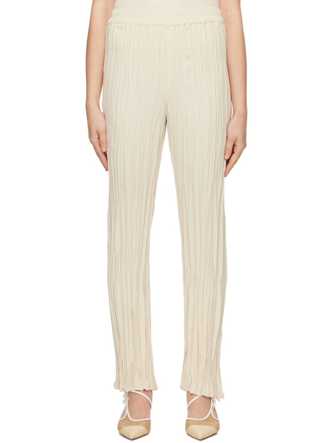 Garment-pleated acetate- and viscose-blend crepe trousers. Elasticized waistband. Supplier color: Cream 50% acetate, 50% viscose. Made in Portugal 241734F087009