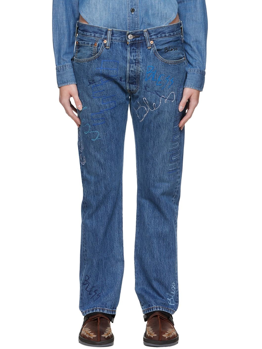 Non-stretch denim jeans. · Belt loops · Five-pocket styling · Button-fly · Text embroidered at front · Silver-tone hardware · Contrast stitching in tan Supplier color: Blue 100% cotton. Made in France 222852F069001