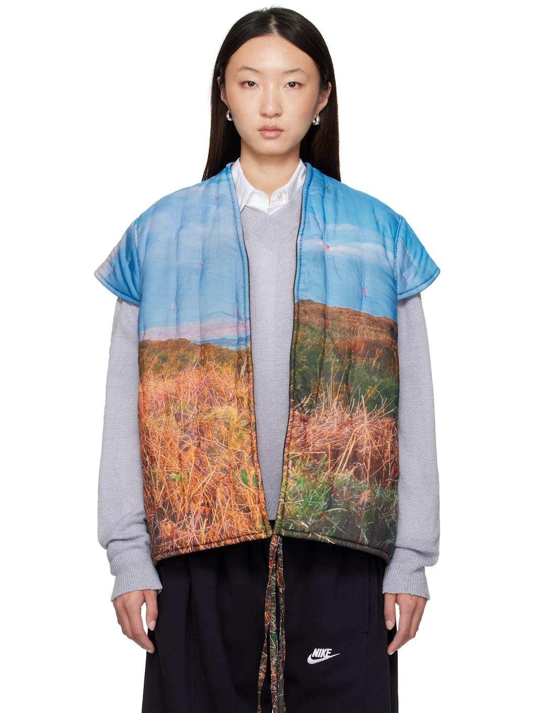 Plain-woven cotton vest. · Tufted detailing and printed graphics throughout · V-neck · Open front · Self-tie straps at front hem · Cap sleeves · Brushed flannel lining with jacquard check pattern · Contrast stitching in red Supplier color: Wasteland 70% cotton, 20% mohair, 10% wool. Made in France 252852F068000