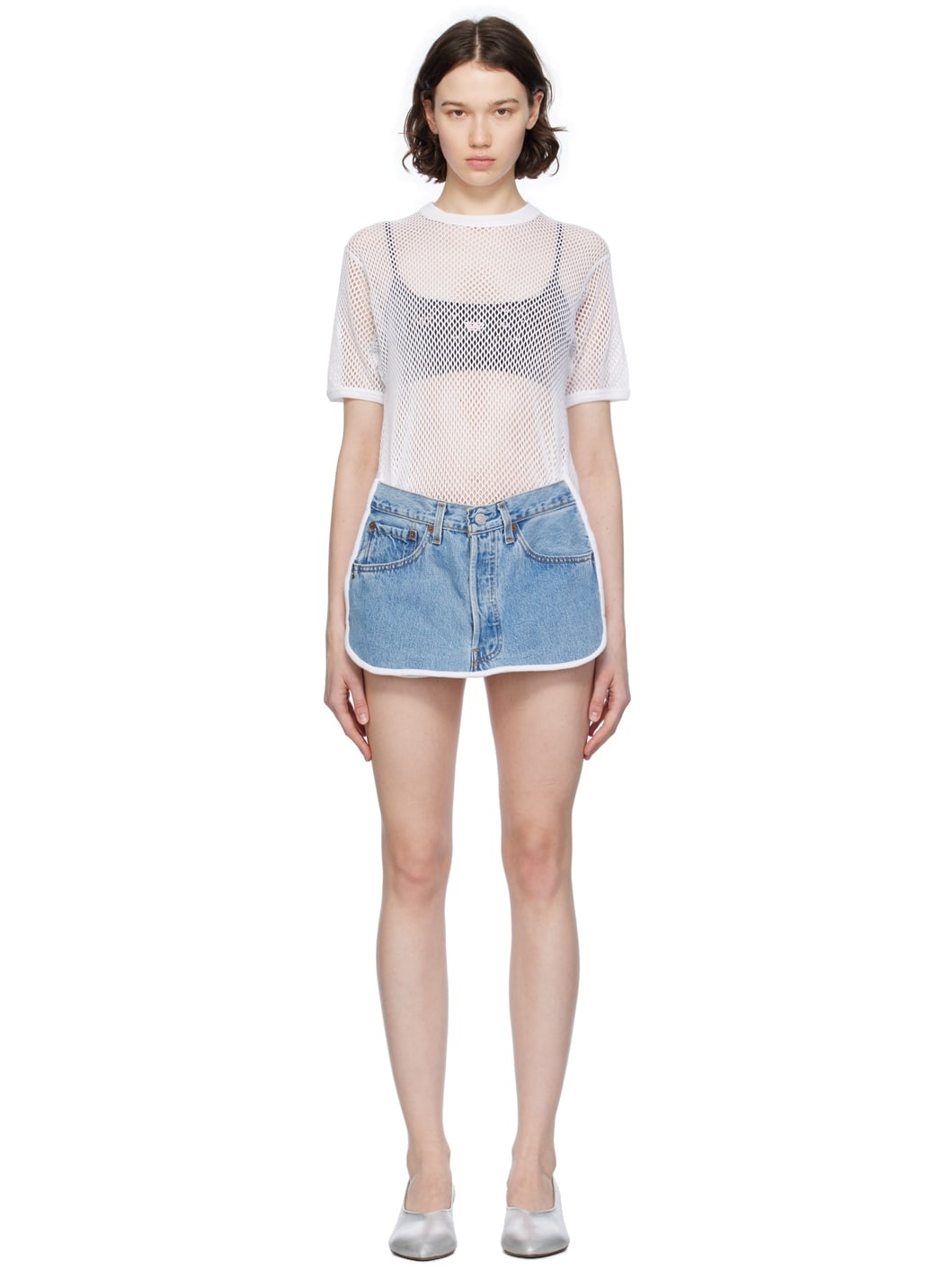 Cotton mesh and upcycled non-stretch denim dress. Rib knit trim and fading throughout. · Layered construction · Crewneck · Three-pocket styling · Zip-fly · Shirttail hem · Contrast stitching in tan Supplier color: Denim blue/White 100% cotton. Made in Germany 241852F052000