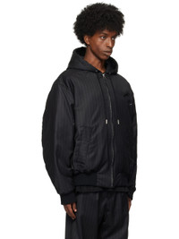 Insulated wool twill bomber jacket. Pinstripes throughout. · Drawstring at hood · Zip closure · Welt pockets · Logo patch at chest · Rib-knit hem and cuffs · Welt and patch pocket at interior · Full quilted satin lining Supplier color: Ash grey Body: 100% wool. Fill: 100% polyester. Lining: 100% acetate. Made in Romania 242950M180000