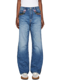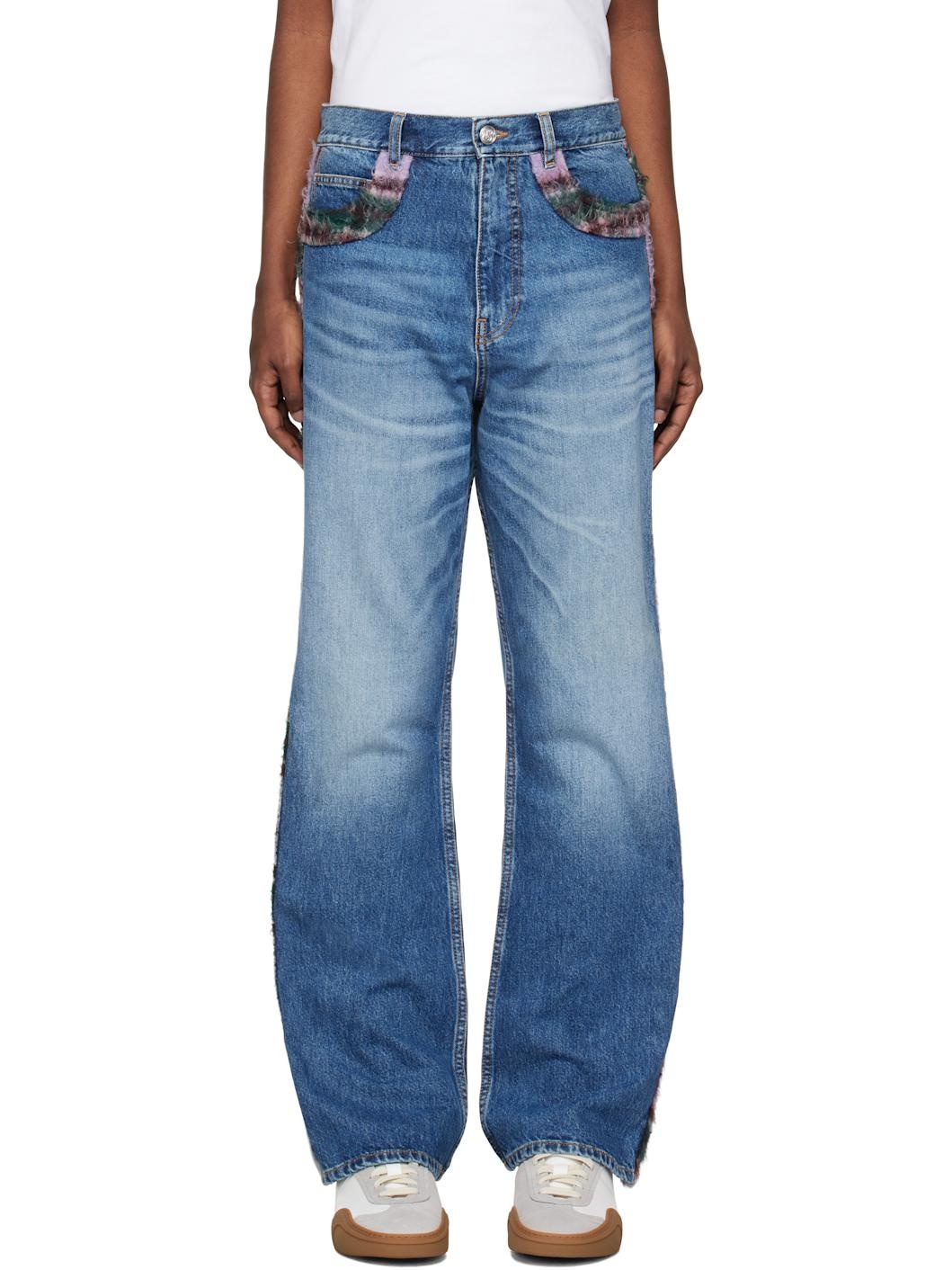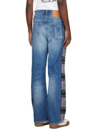 Bootcut non-stretch denim jeans. Fading and whiskering throughout. · Belt loops · Five-pocket styling · Zip-fly · Brushed plaid trim at front pockets and outseams · Leather logo patch at back waistband · Logo printed at back pocket · Logo-engraved silver-tone hardware · Contrast stitching in tan Supplier color: Stonewash blue Body: 100% cotton. Trim: 70% polyester, 30% wool. Made in Tunisia 242950M186001