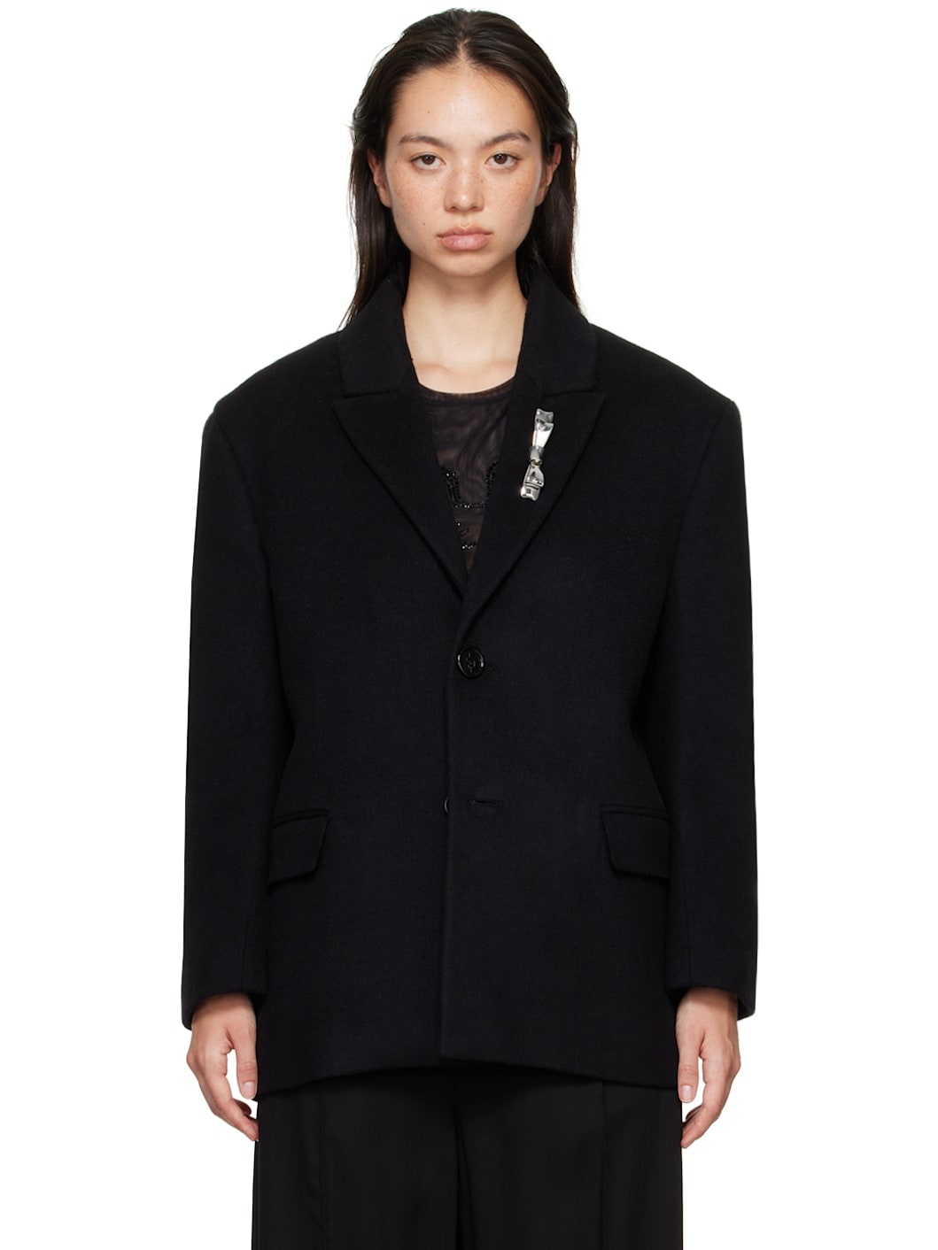 Oversized felted wool- and nylon-blend blazer. · Detachable bow pin at peaked lapel · Button closure · Flap pockets · Darts at front · Four-button surgeon's cuff · Full acetate- and viscose-blend twill lining Supplier color: Black Body: 40% wool, 30% nylon, 30% viscose. Lining 1: 52% acetate, 48% viscose. Lining 2: 50% wool, 50% viscose. Made in Portugal 242901F057000