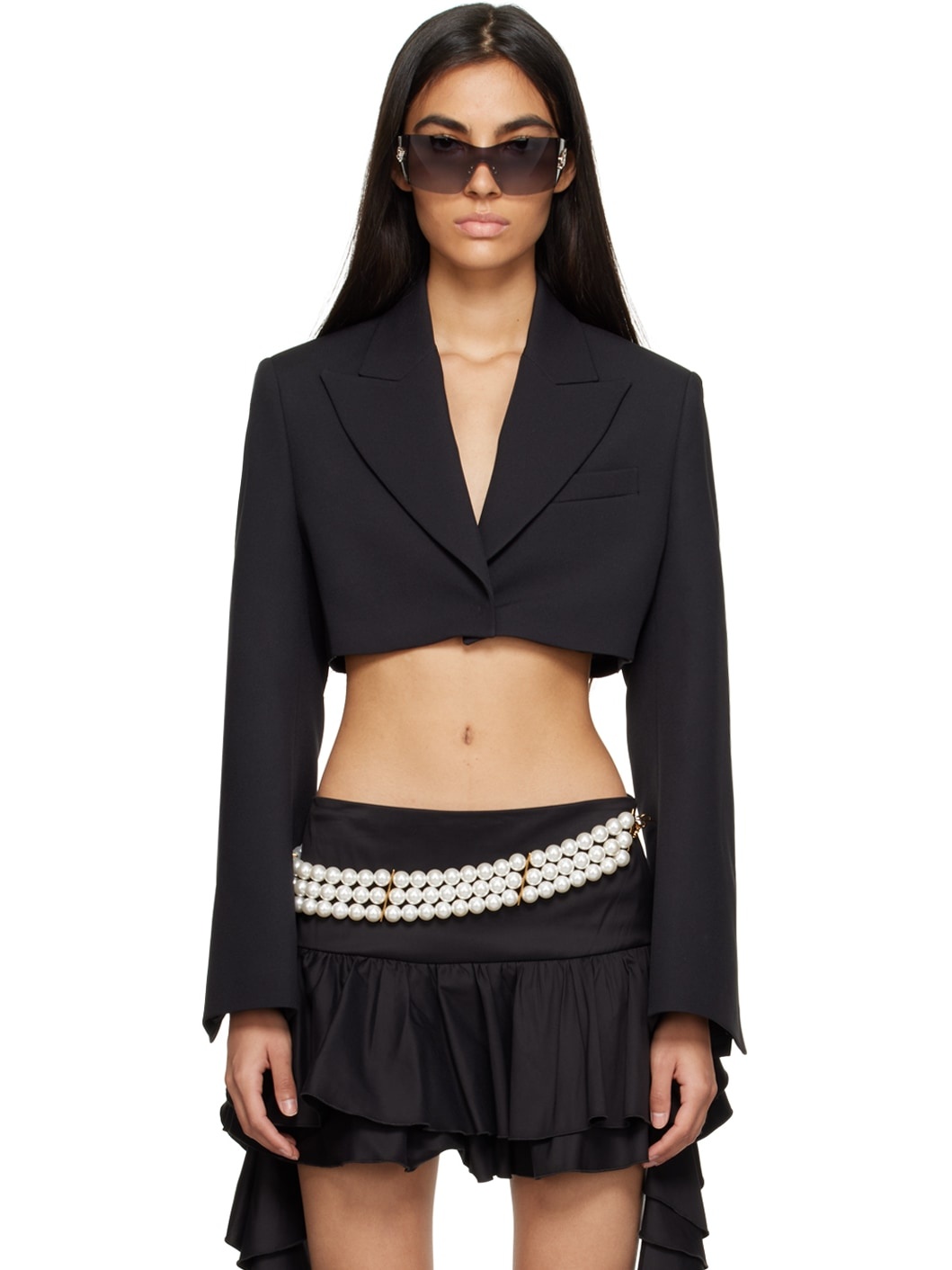 Stretch polyester twill blazer. · Peaked lapel · Concealed button closure · Welt pocket · Cropped hem · Padded shoulders · Vents at flared cuffs · Full viscose-blend satin lining Supplier color: Nero Body: 96% polyester, 4% elastane. Lining: 52% viscose, 48% cupro. Made in Italy 231901F057001