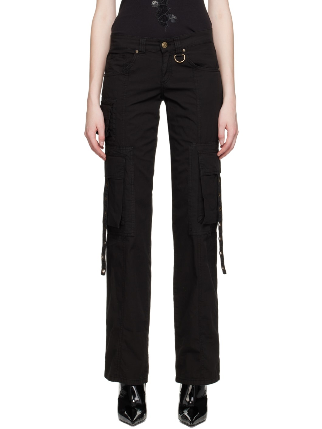 Plain-woven stretch cotton trousers. · Belt loops · Five-pocket styling · Zip-fly · D-ring at front · Strap and bellows pocket at outseams · Logo embroidered at back waistband · Logo-engraved gunmetal-tone hardware Supplier color: Nero