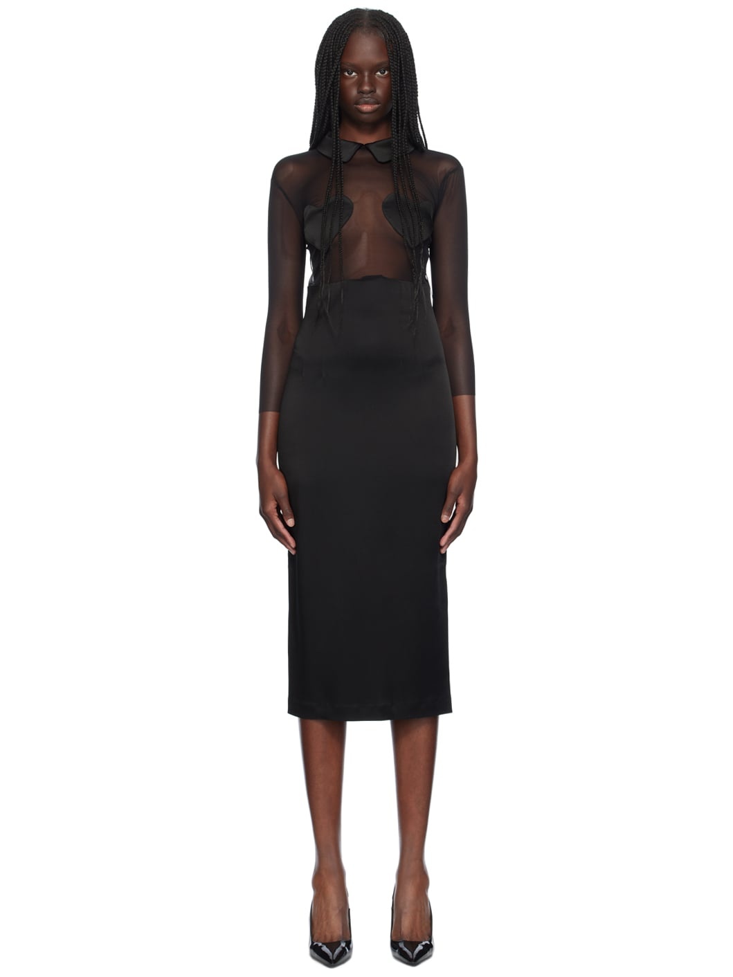 Stretch acetate- and viscose-blend satin and sheer stretch nylon mesh dress. · Peter Pan collar · Graphic appliques at chest · Concealed zip closure at back · Central vent at back hem Supplier color: Black Body 1: 71% acetate, 27% viscose, 2% elastane. Body 2: 82% polyamide, 18% elastane. Lining: 100% polyester. Made in Italy 242901F054011