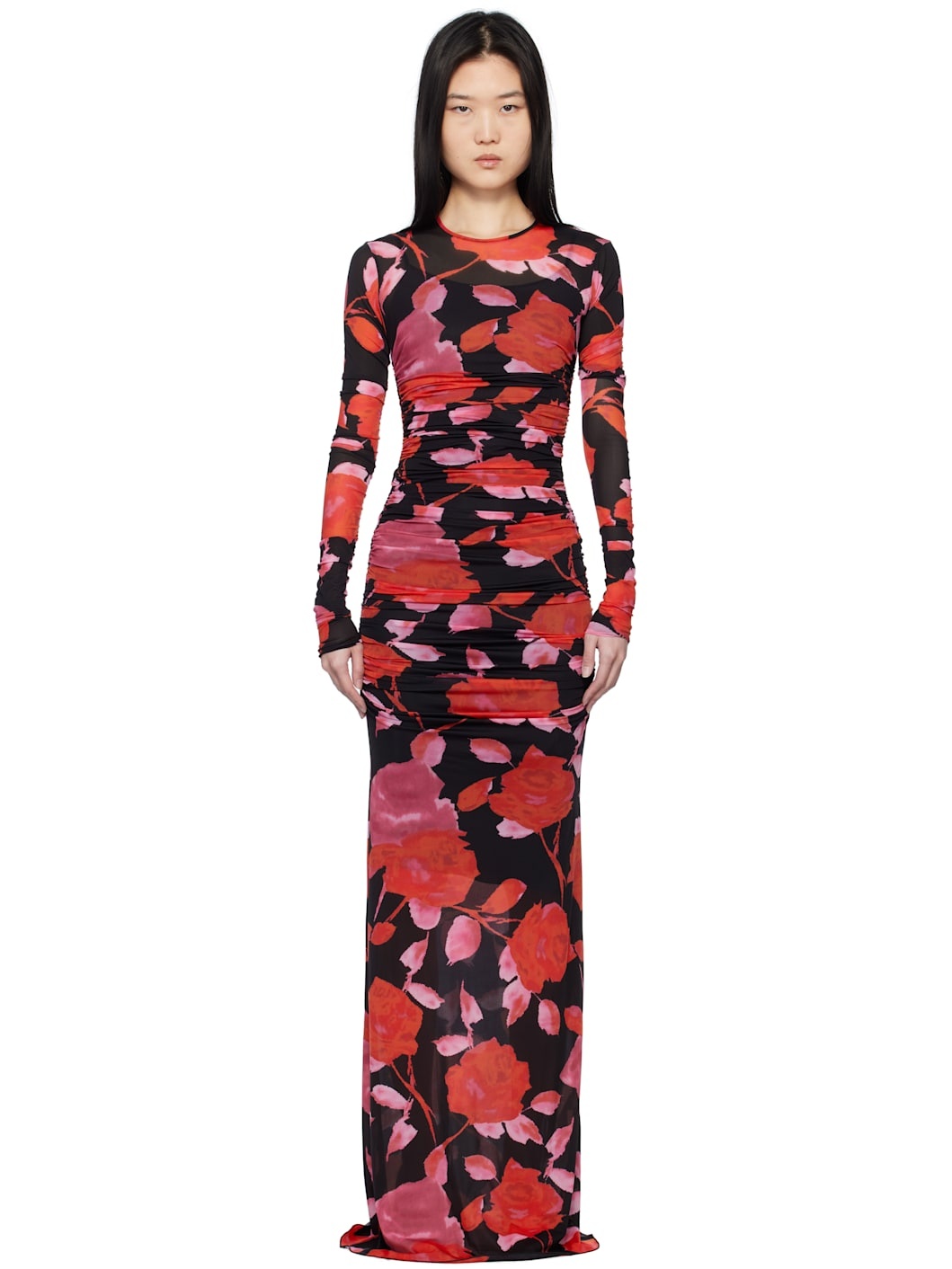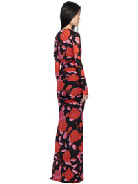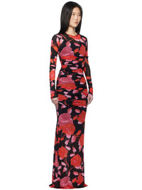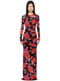 Stretch nylon jersey maxi dress. Ruching and floral pattern printed throughout. · Round neck · Removable sleeveless slip Supplier color: Black/Rouge Body 1: 90% nylon, 10% elastane. Body 2: 75% nylon, 25% elastane. Made in Italy 251901F055002