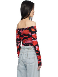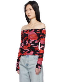 Stretch nylon jersey top. Ruching and floral pattern printed throughout. · Off-the-shoulder construction · Partially lined Supplier color: Black/Rouge Body: 90% nylon, 10% elastane. Lining: 75% nylon, 25% elastane. Made in Italy 251901F107000