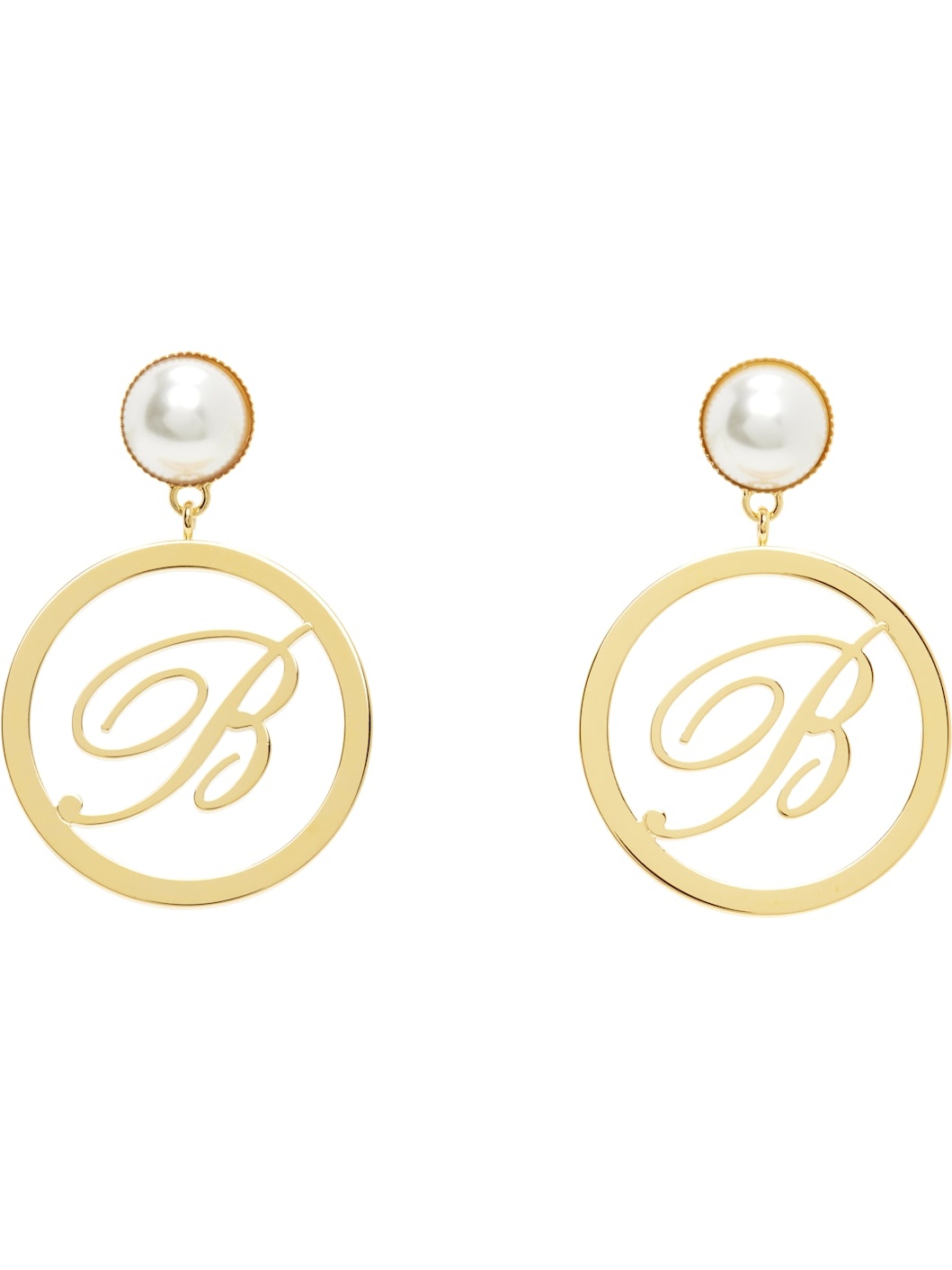Pair of drop earrings in gold-tone brass. · Faux-pearl at face · Logo charm at drop · Post-stud fastening · H2" x W1.75" Supplier color: Ivory/Gold Brass, plastic. Made in Italy 251901F022001