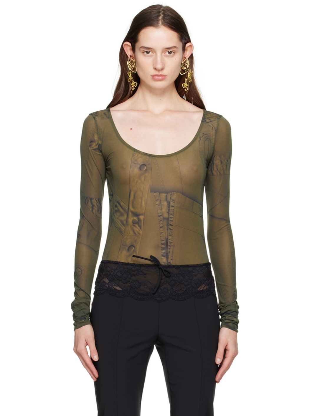 Semi-sheer stretch nylon jersey bodysuit. Trompe l'œil pattern printed throughout. · Scoop neck · Press-stud fastening at bottom Supplier color: Militare/Nero 90% polyamide, 10% elastane. Made in Italy 241901F358002