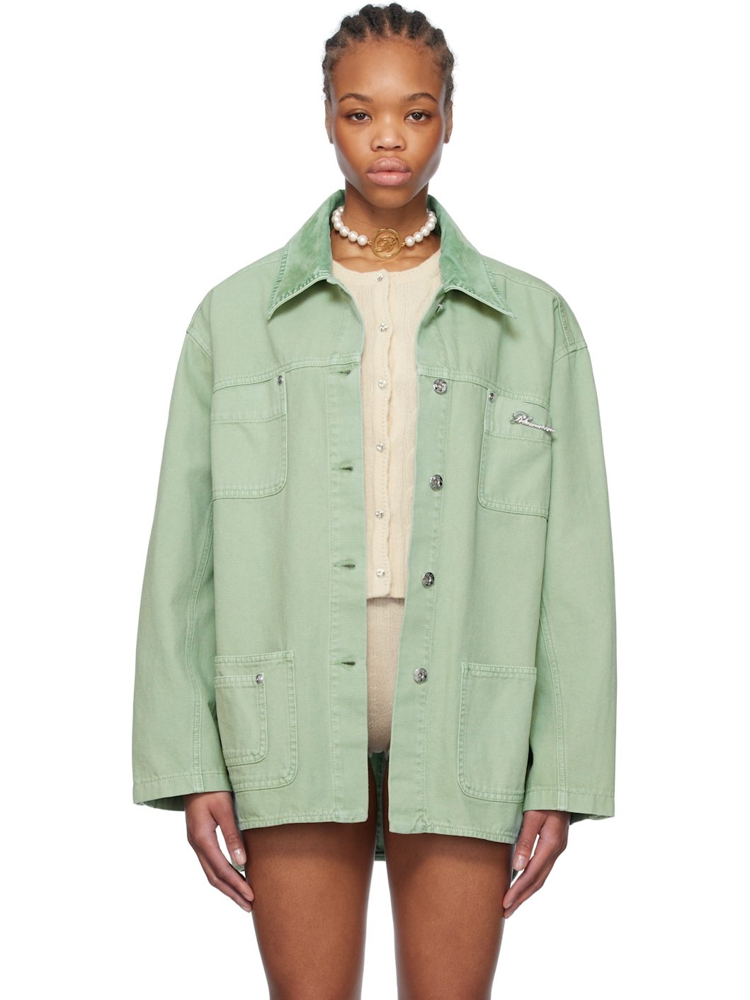 Cotton canvas jacket. · Velvet spread collar · Button closure · Patch pockets · Detachable crystal-cut logo brooch at chest · Shirttail hem · Vented side seams · Single-button barrel cuffs · Embroidered logo patch at back · Logo-engraved silver-tone hardware Supplier color: Sage green Body: 100% cotton. Trim: 50% cotton, 50% viscose. Made in Albania 251901F063001