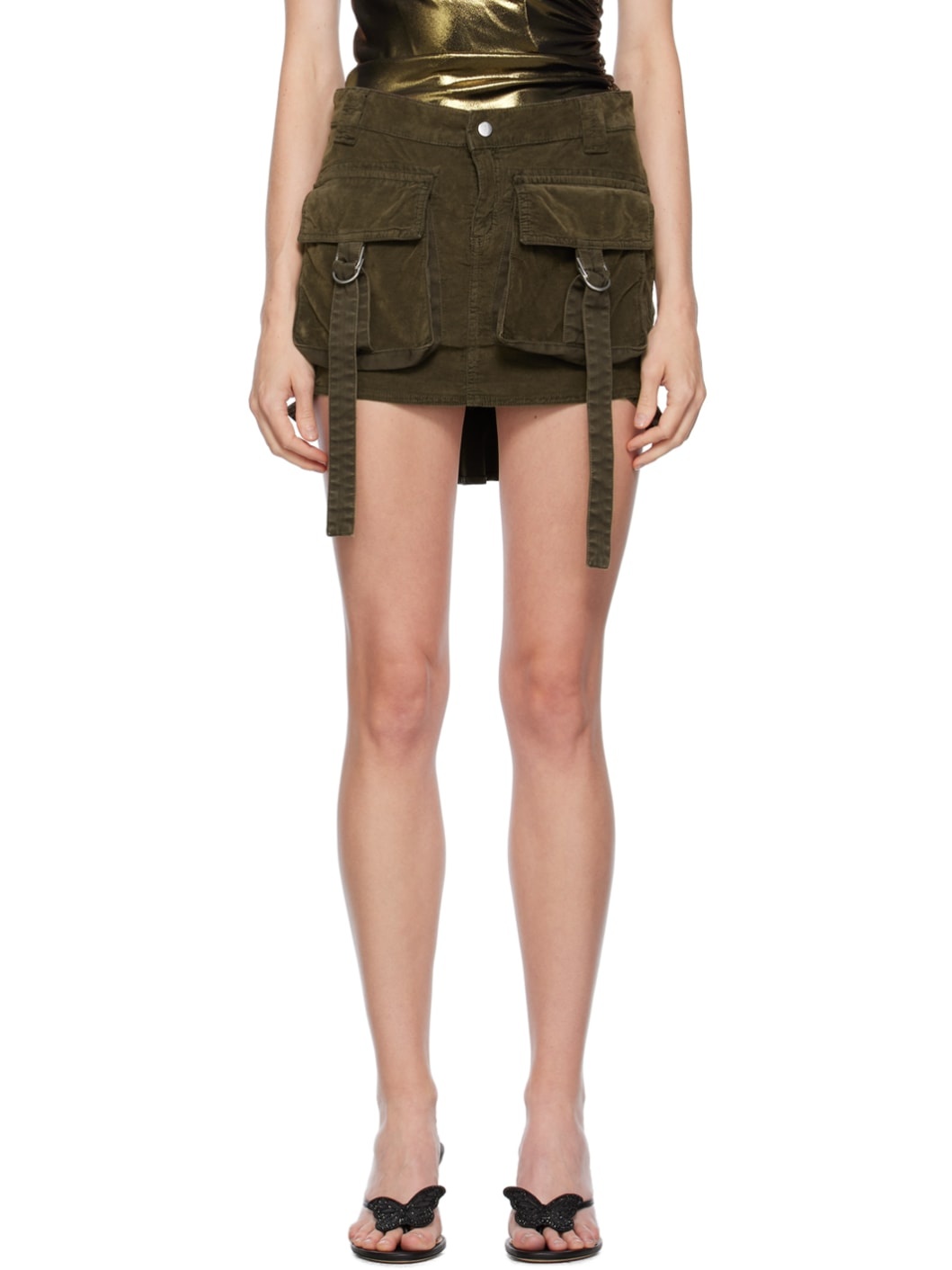 Stretch cotton velvet skirt. · Low-rise · Belt loops · Zip-fly · Bellows pockets with cinch fastening · Logo patch at back waistband · Ruffled trim at back hem Supplier color: Dark olive