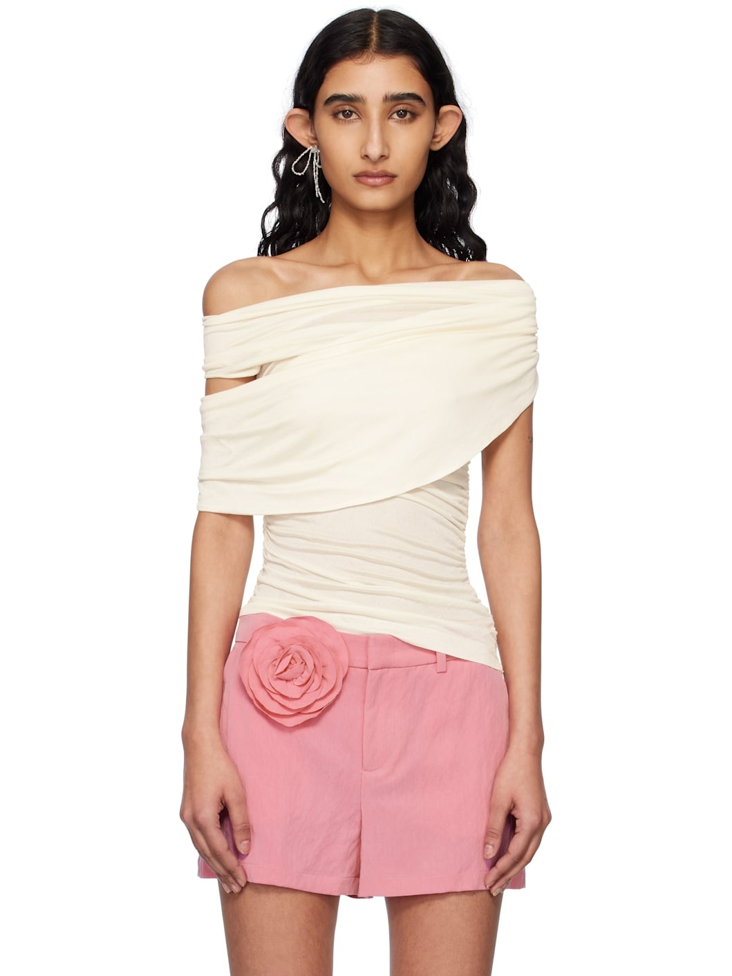 Viscose jersey blouse. Draping and ruching throughout. · Single-shoulder construction · Sash-style overlay · Asymmetric hem · Concealed zip closure at side · Low back · Unlined Supplier color: Butter 100% viscose. Made in Portugal 251901F107003