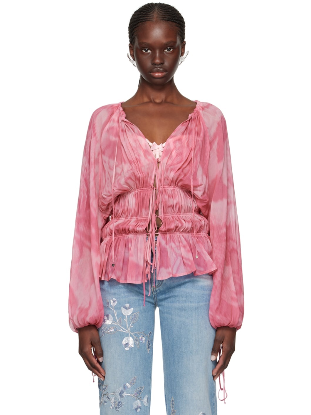 Semi-sheer viscose georgette blouse. Graphic pattern throughout. · Self-tie fastening at plunging V-neck · Self-tie closure · Shirring at waist · Flared hem · Raglan balloon sleeves · Self-tie fastening at cuffs Supplier color: Rose wine/Wild