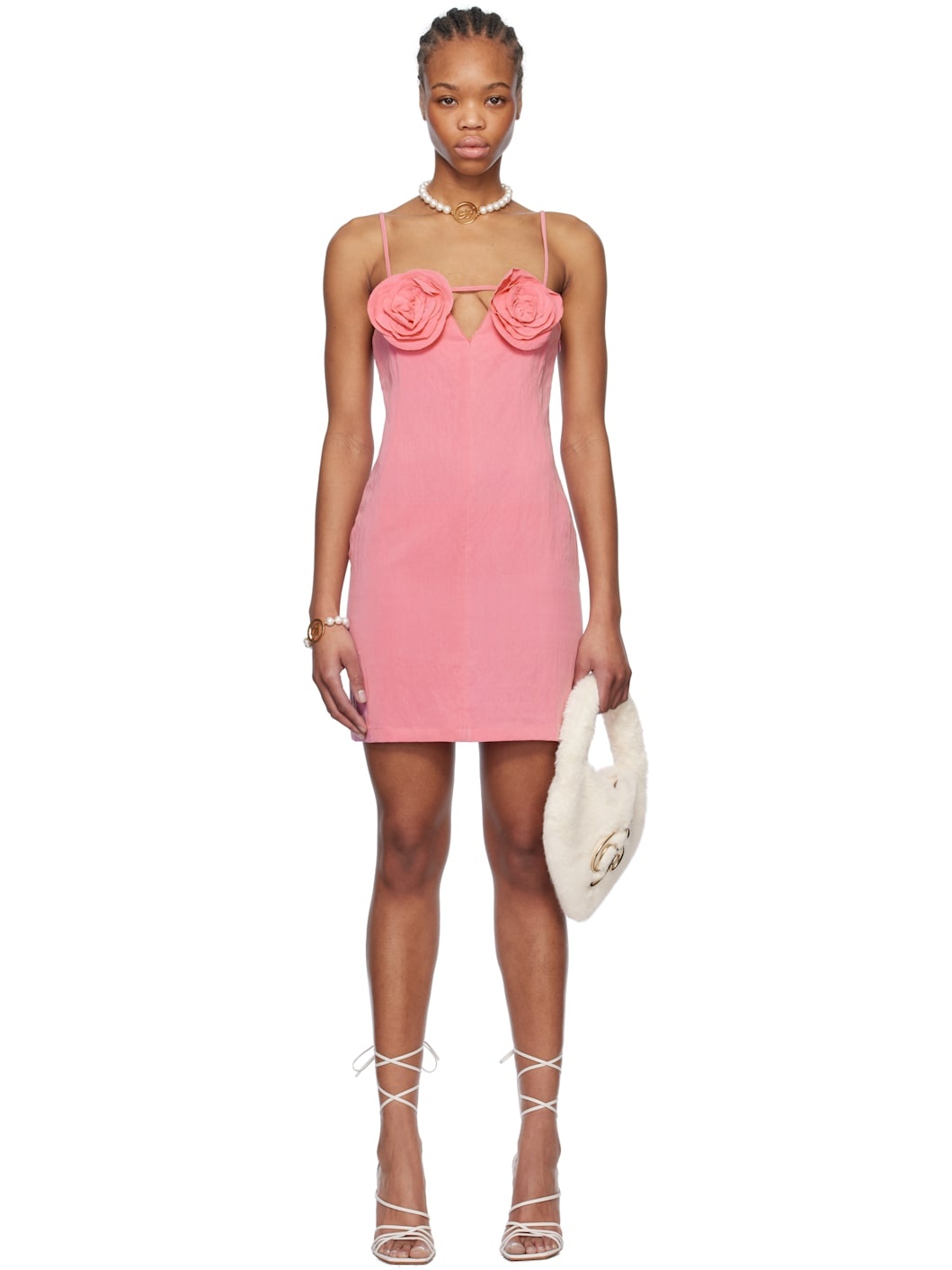Viscose-blend gabardine minidress. · Paneled construction · Scalloped edge at V-neck · Strap with floral appliques at chest · Fixed spaghetti straps · Concealed zip closure at side · Low back · Unlined Supplier color: Pink peony 93% viscose, 7% polyamide. Made in Italy 251901F052012