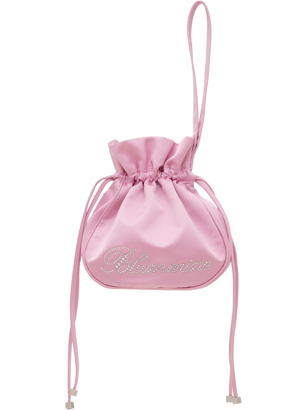 Satin pouch in pink. · Wristlet at side · Crystal-cut logo applique at face · Drawstring closure · Fully lined · H6" x W7" x D3" Supplier color: Dalia pink 100% polyester. Made in Italy 251901F045002