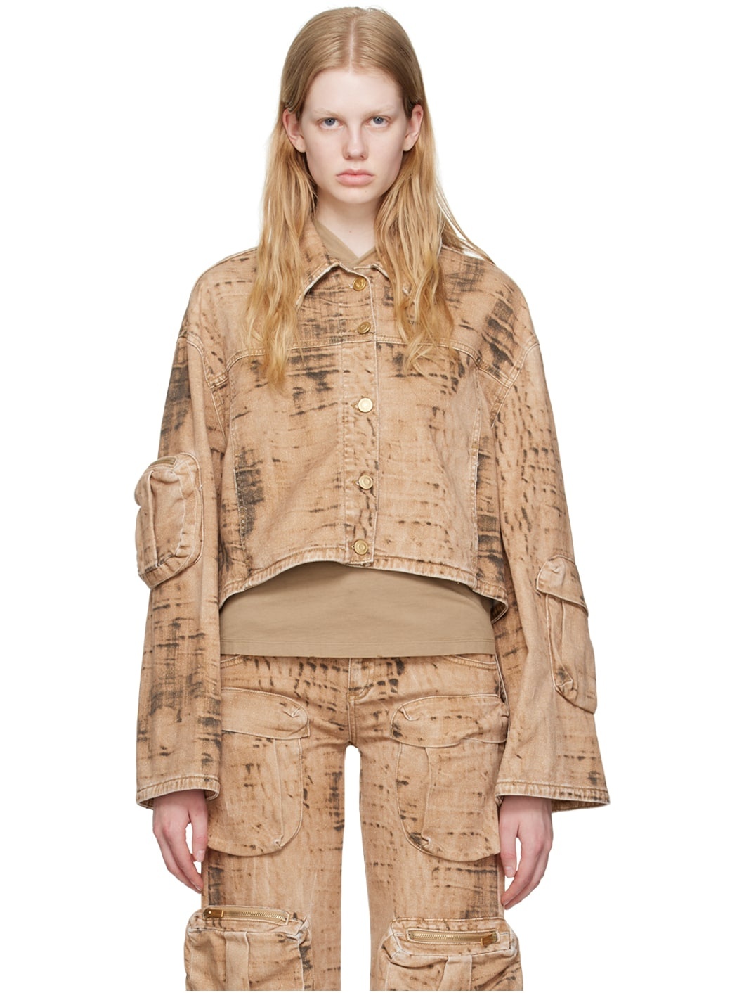 Stretch denim jacket. Camouflage pattern printed throughout. · Spread collar · Button closure · Cargo pocket at sleeves · Logo hardware at back yoke · Unlined · Logo engraved gold-tone hardware Supplier color: Lark/Vetiver 98% cotton, 2% elastane. Made in Albania 231901F060004