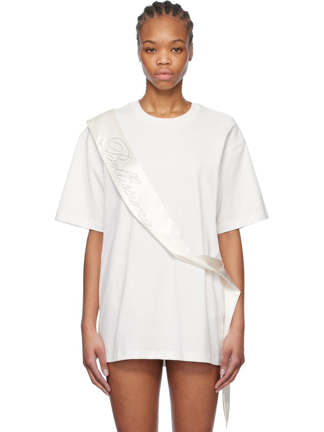 Cotton jersey T-shirt. · Rib-knit crewneck · Satin sash-style overlay with crystal-cut text appliques · Dropped shoulders Supplier color: Optical white Body: 100% cotton. Trim 1: 100% polyester. Trim 2: 100% glass. Made in Italy 251901F110001