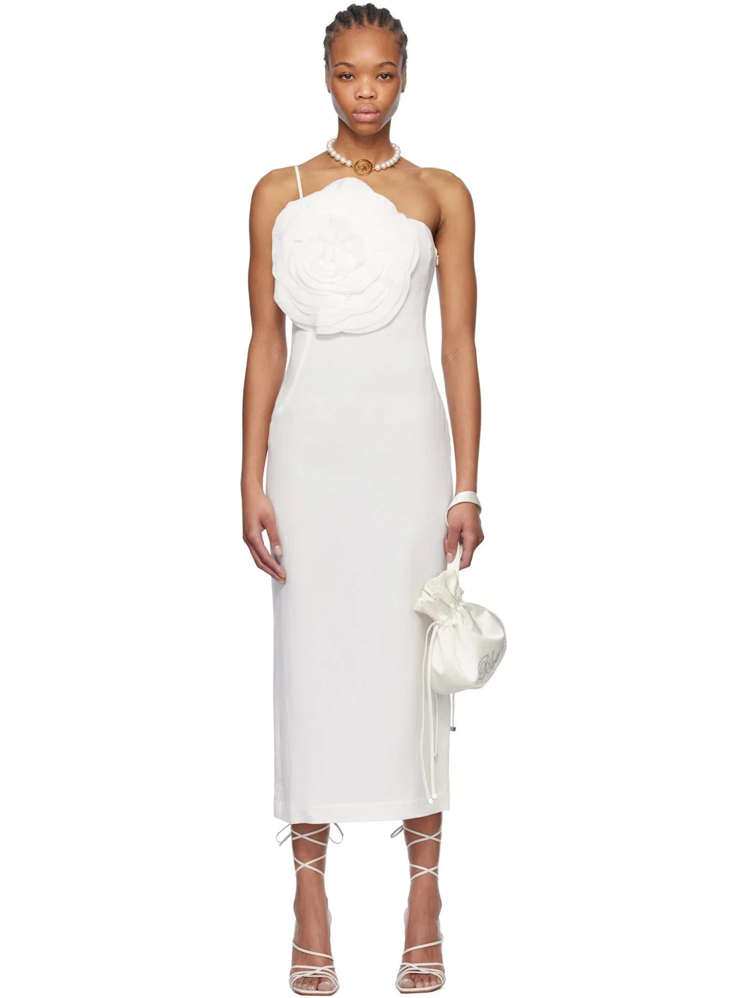 Viscose-blend gabardine midi dress. · Single-shoulder construction · Floral applique at chest · Darts at front and back · Concealed zip closure at side · Central vent at back hem Supplier color: White pearl 93% viscose, 7% polyamide. Made in Italy 251901F054007