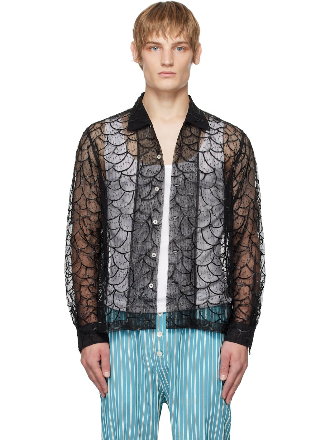 Sheer nylon mesh shirt. Sequinned scalloped pattern throughout. · Open spread collar · Button closure · Pleated single-button barrel cuffs · Pleats at back yoke This item is part of a limited run of 39. Supplier color: Black 100% nylon. Made in India 251169M192004