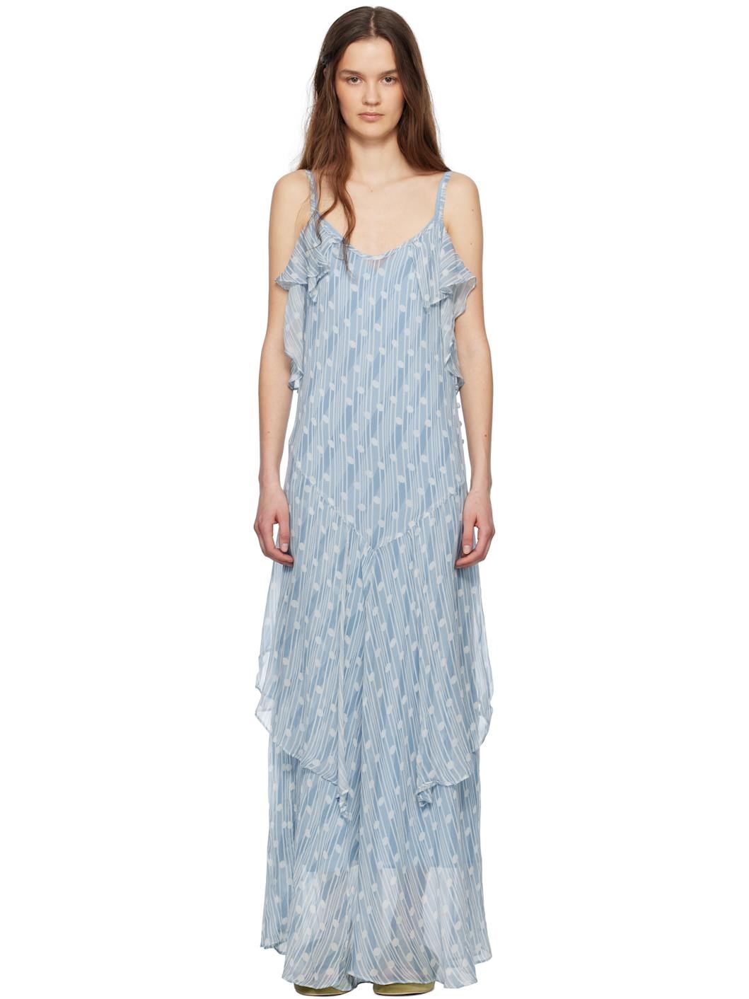 Semi-sheer silk gauze maxi dress. Ruffled trim, stripes, and polka dot pattern throughout. · Plunging V-neck · Fixed spaghetti straps · Removable silk crepe slip-style lining This item is part of a limited run of 30. Supplier color: Blue 100% silk. Made in India 251169F055001