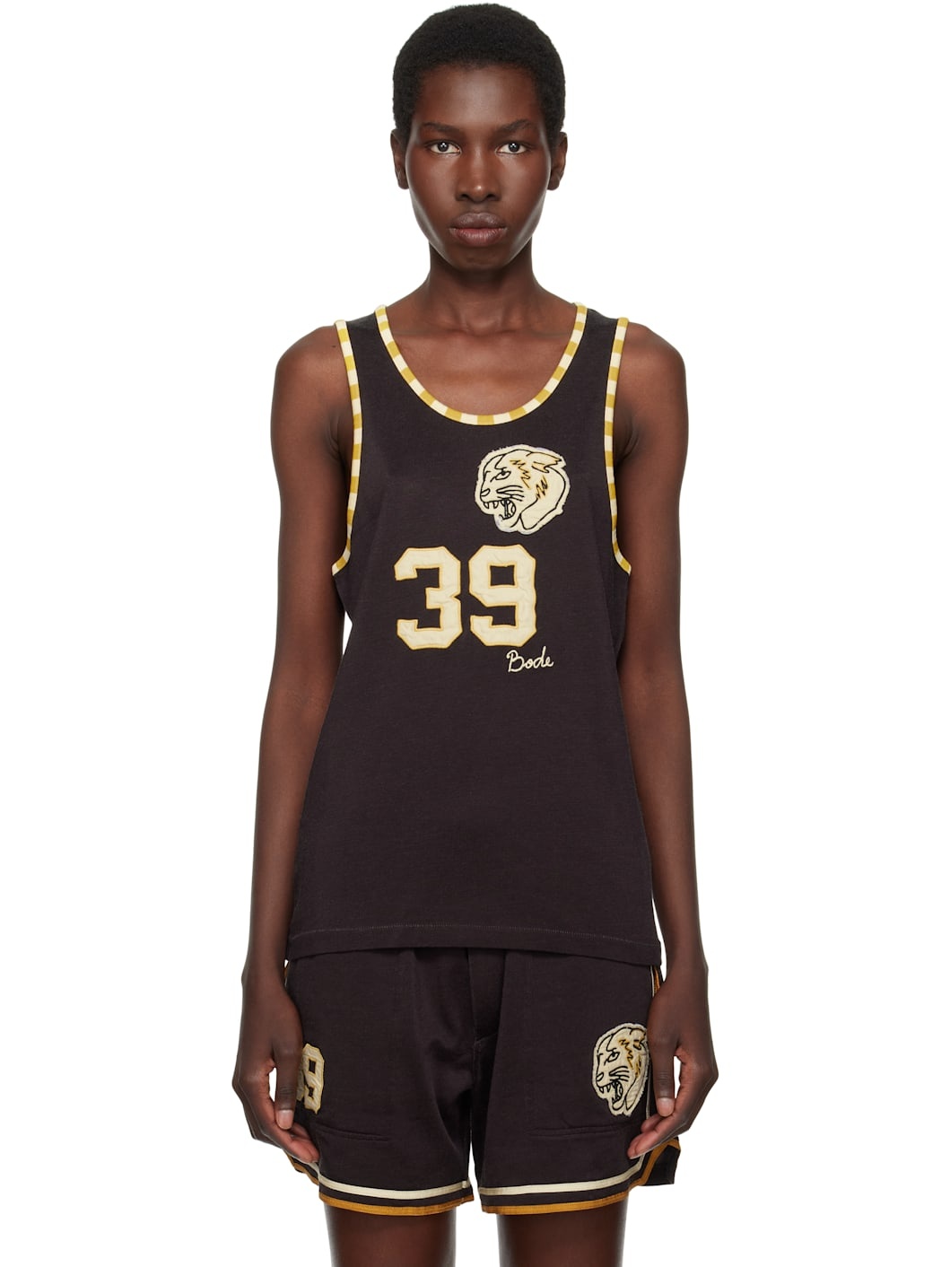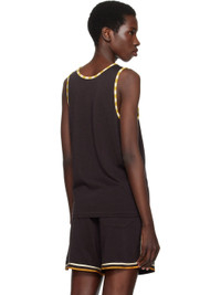 Rayon- and cotton-blend jersey tank top. · Stripes at scoop neck and armscyes · Graphic and text appliques at chest · Logo embroidered at front This item is part of a limited run of 63. Supplier color: Brown/Black 53% rayon, 47% cotton. Made in Portugal 251169F111004