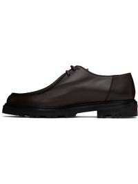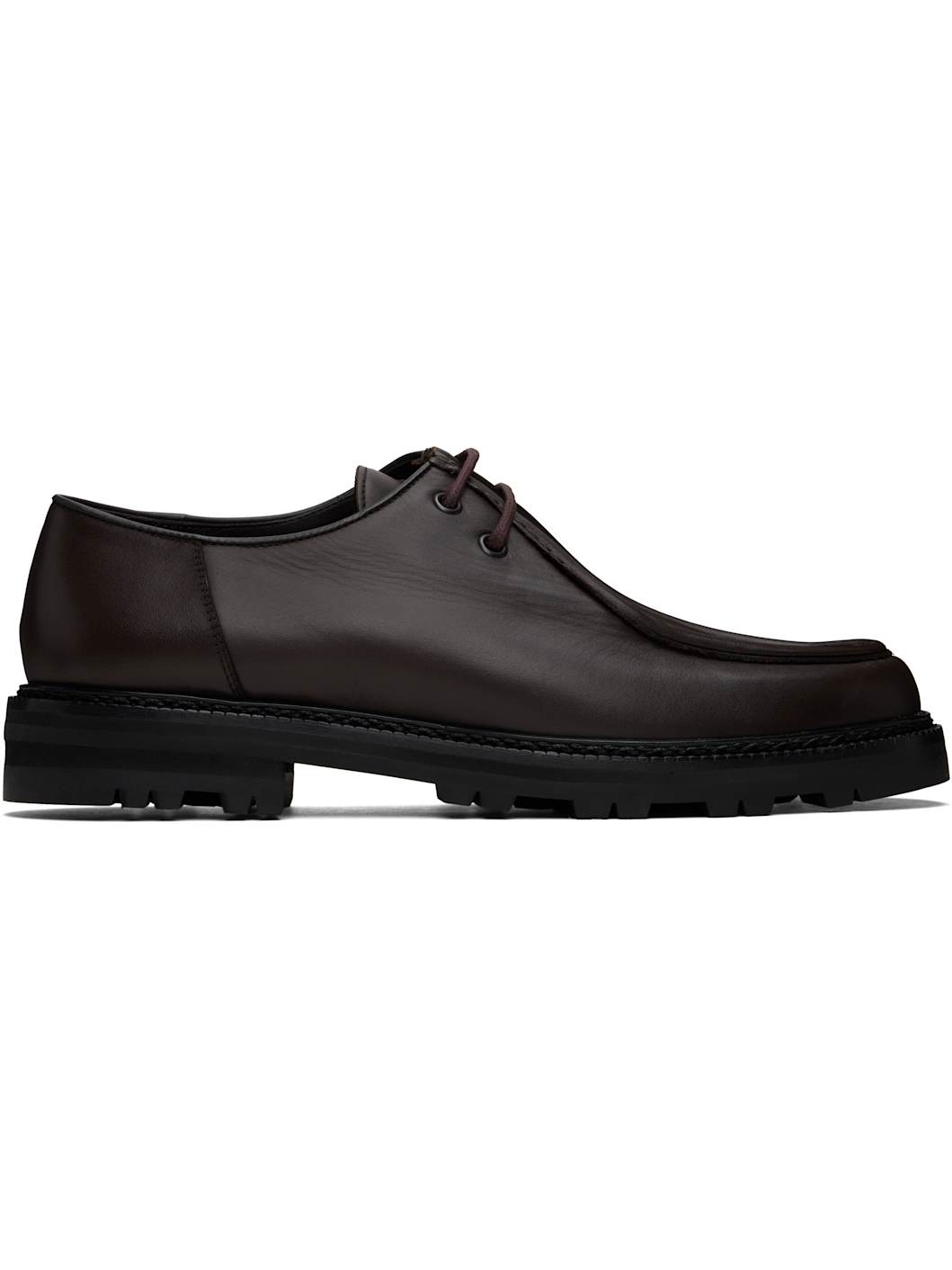 Buffed nappa calfskin derbys in brown. · Moc toe · Lace-up closure · Grained leather and suede lining · Topstitching and serrated edge at welt · Treaded rubber sole Supplier color: Brown Upper: calfskin. Sole: rubber. Made in Italy 251169M225001