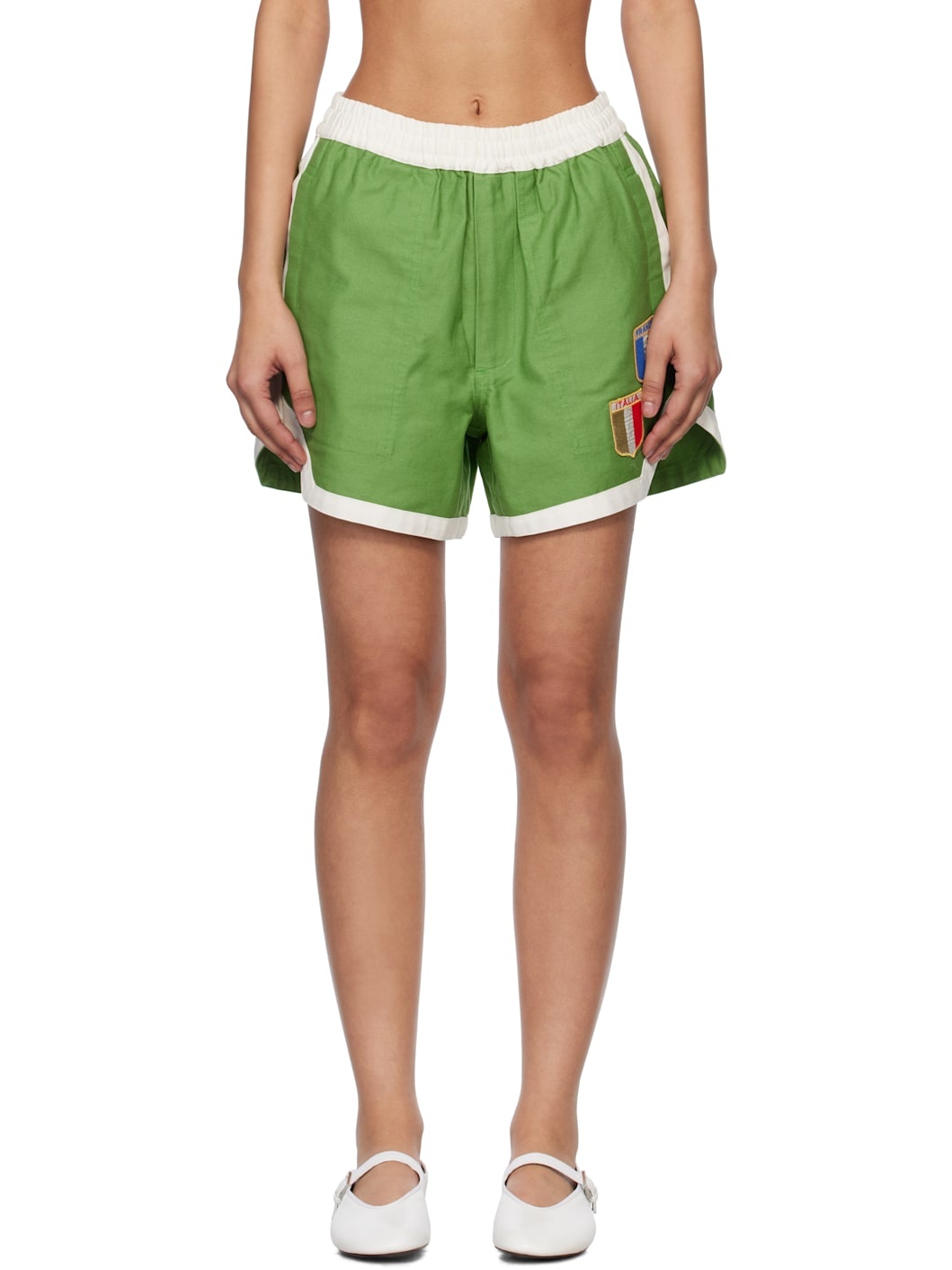 Cotton twill shorts. · Concealed drawstring at elasticized waistband · Three-pocket styling · Zip fly · Graphic patches at front · Vented cuffs · Logo embroidered at back pocket This item is part of a limited run of 90. Supplier color: Green 100% cotton. Made in India 251169F088009