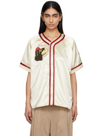 Viscose- and cotton-blend satin shirt. · Striped webbing trim at Y-neck and cuffs · Button closure · Logo embroidered at chest · Embroidered graphic applique at chest and sleeve · Shirttail hem · Raglan sleeves This item is part of a limited run of 91. Supplier color: Cream 54% viscose, 46% cotton. Made in India 252169F108000