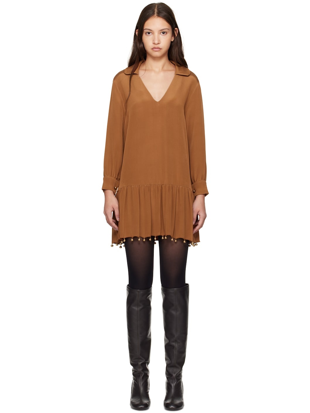 Silk satin minidress. · Spread collar · Plunging V-neck · Gathering at dropped waist and cuffs · Beaded detailing at hem · Single-button barrel cuffs · Logo-engraved gold-tone hardware This item is part of a limited run of 21. Supplier color: Brown/Brown 100% silk. Made in Portugal 251169F052001