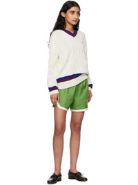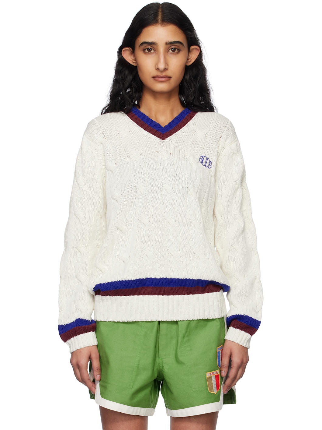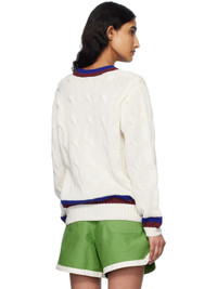 Cable-knit cotton sweater. · Stripes at rib-knit V-neck, hem, and cuffs · Logo embroidered at chest · Dropped shoulders This item is part of a limited run of 60. Supplier color: Cream 100% cotton. Made in Romania 251169F100000
