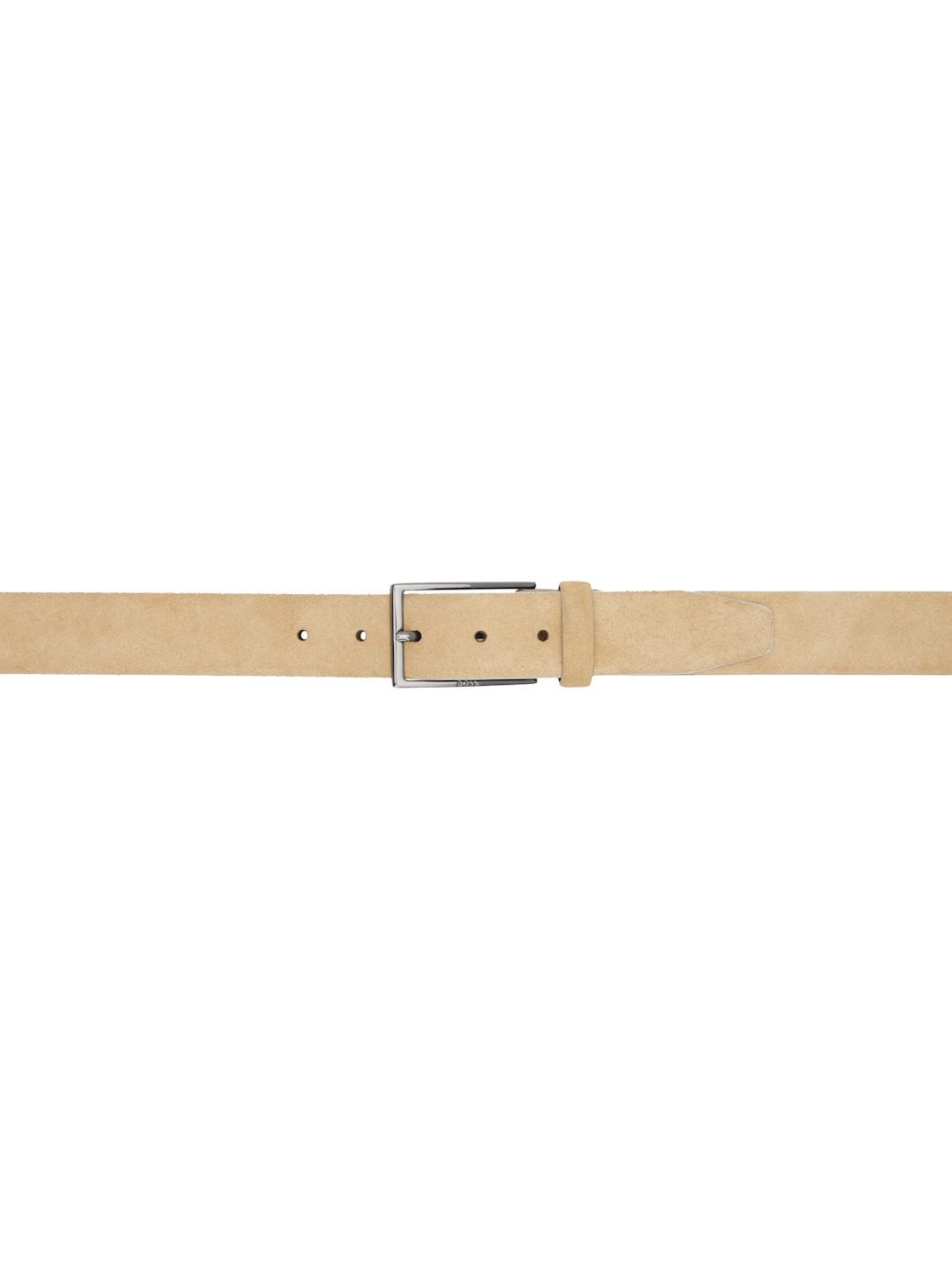 Handcrafted suede belt in beige. · Pin-buckle fastening · Logo-engraved gunmetal-tone hardware · W1.25" Supplier color: Medium brown Leather. Made in Tunisia 252085M131014