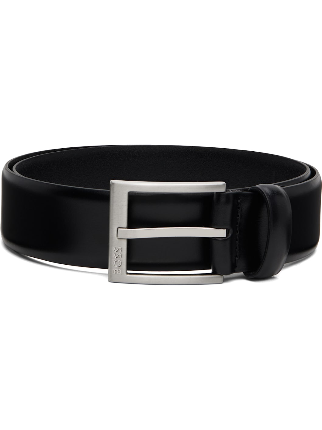 Buffed leather belt in black. · Keeper loop at length · Logo-engraved pin-buckle fastening · Brushed silver-tone hardware · W1.5" Supplier color: Black Leather. Made in Romania 252085M131010