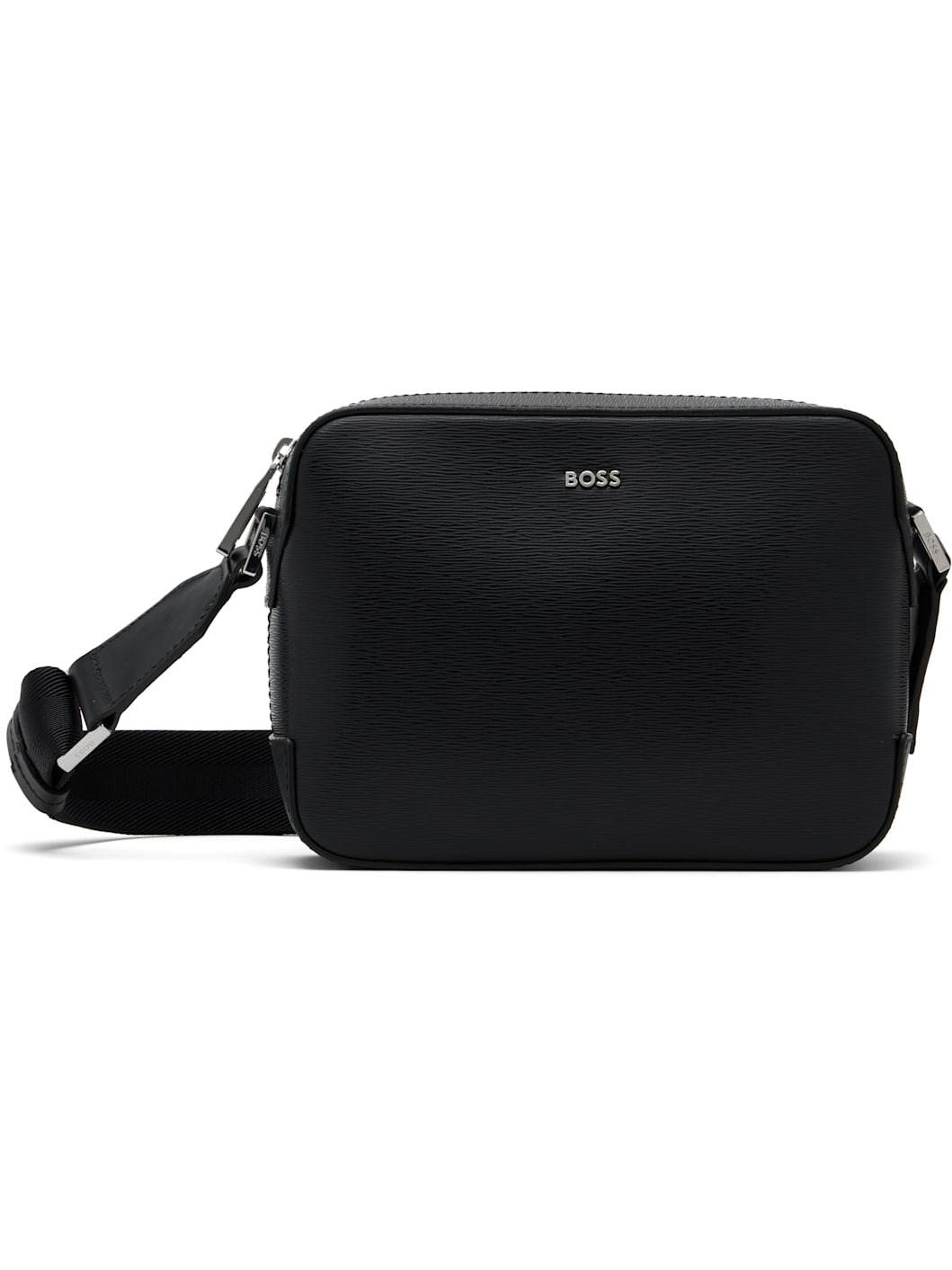 Saffiano leather messenger bag. · Adjustable crossbody strap · Logo hardware at face · Patch pocket at back face · Zip closure · Patch pocket at interior · Logo-woven twill lining · Logo engraved silver-tone hardware · H6.25" x W8" x D2" Supplier color: Black Leather. Made in Romania 252085M170028