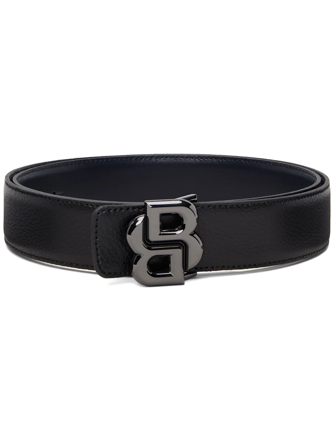 Reversible grained leather belt. Reverse in navy polished leather. · Logo-engraved post-stud buckle · Keeper loop with enameled plaque at front · Silver-tone hardware · W1.25" Supplier color: Black Leather. Made in Italy 261085M131002