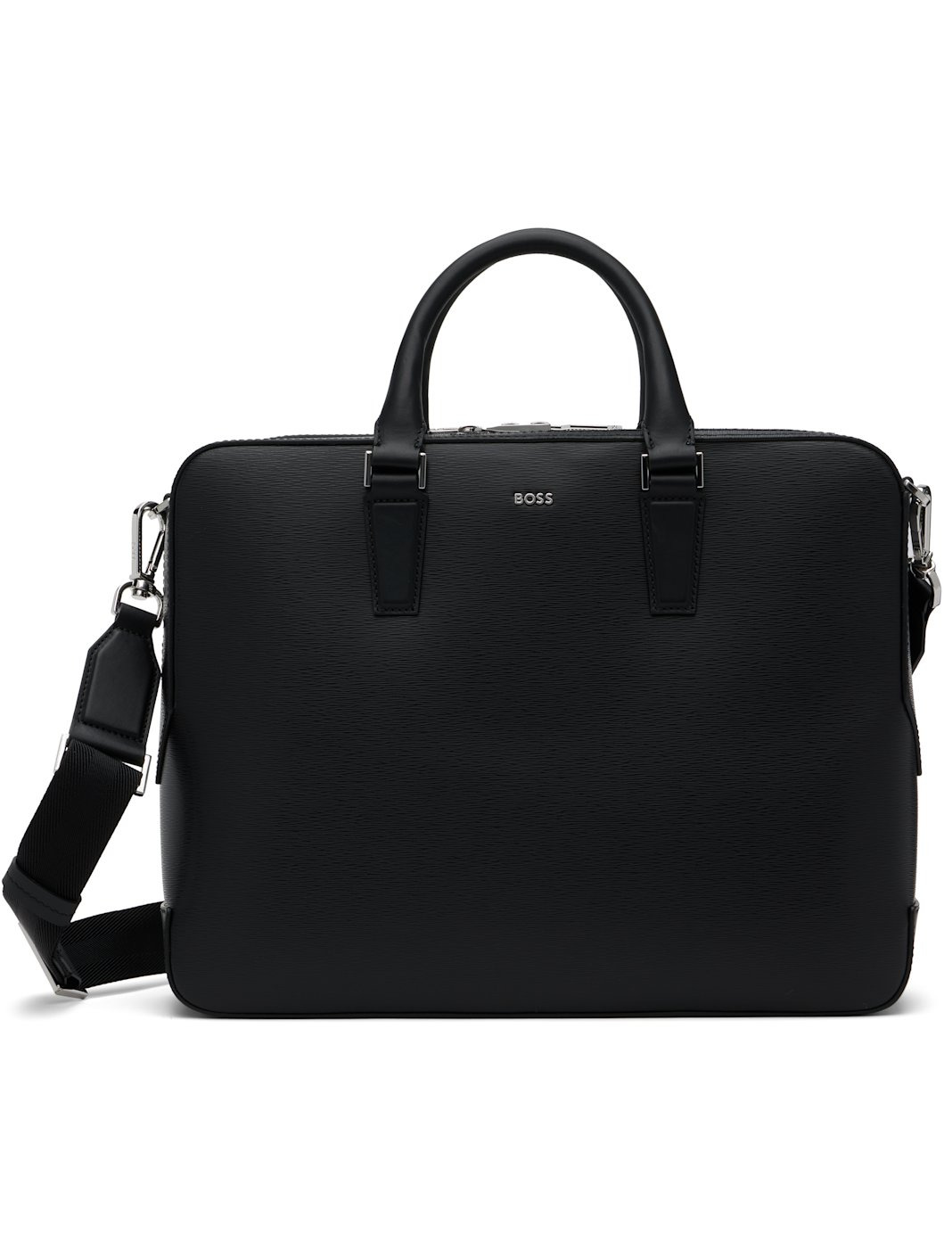 Saffiano leather briefcase. · Twin rolled carry handles · Adjustable and detachable crossbody strap · Zip pocket at top · Logo hardware at face · Luggage strap at back face · Two-way zip closure · Zip pocket at interior · Laptop compartment · Logo-woven satin lining · H11" x W14.5" x D3" Supplier color: Black Leather. Made in Romania 252085M167006