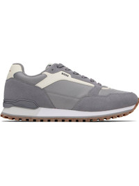 Low-top mesh and brushed suede sneakers. · Textured rubber trim throughout · Lace-up closure · Logo patch at padded tongue · Padded collar · Logo embossed at outer side · Logo stripes embroidered at heel tab · Terrycloth lining · Treaded rubber sole Supplier color: Medium grey Upper: textile, leather. Sole: rubber. Made in Viet Nam 252085M237042
