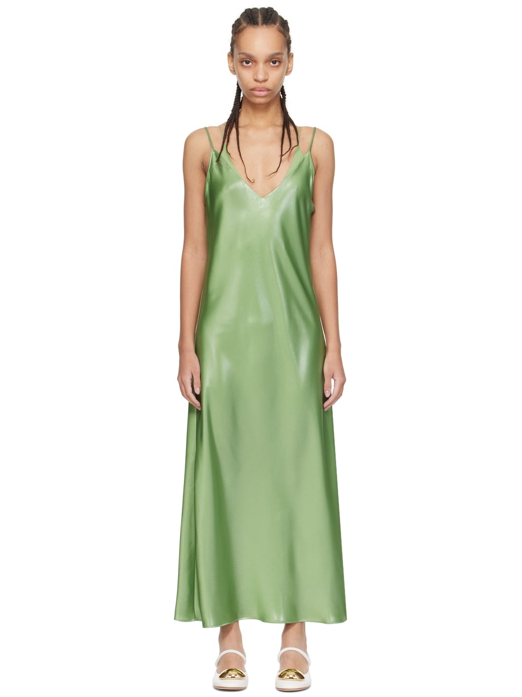 Lightweight polyester- and recycled polyester-blend satin dress. Metallic thread detailing throughout. · Layered construction · Plunging V-neck · Fixed spaghetti straps Supplier color: Open green Body 1: 68% polyester, 32% recycled polyester. Body 2: 100% viscose. Made in Portugal 241085F054003