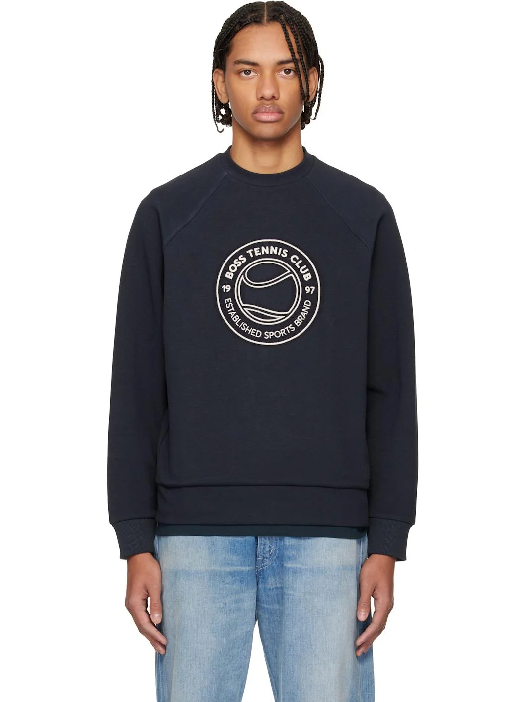 Stretch cotton-blend fleece sweatshirt. · Rib-knit crewneck, hem, and cuffs · Embroidered logo graphic at chest · Raglan sleeves Supplier color: Dark Blue Body: 53% cotton, 44% polyester, 3% elastane. Trim: 95% cotton, 5% elastane. Made in Turkey 261085M204010