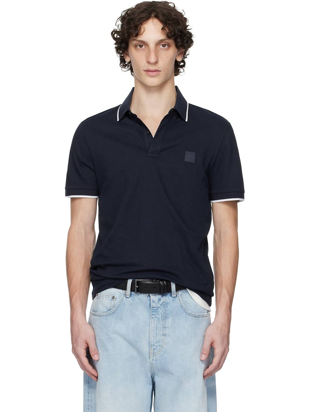 Cotton pique polo. · Striped rib-knit spread collar and cuffs · Two-button placket · Logo patch at chest Supplier color: Dark blue 95% cotton, 5% elastane. Made in Bangladesh 252085M212016