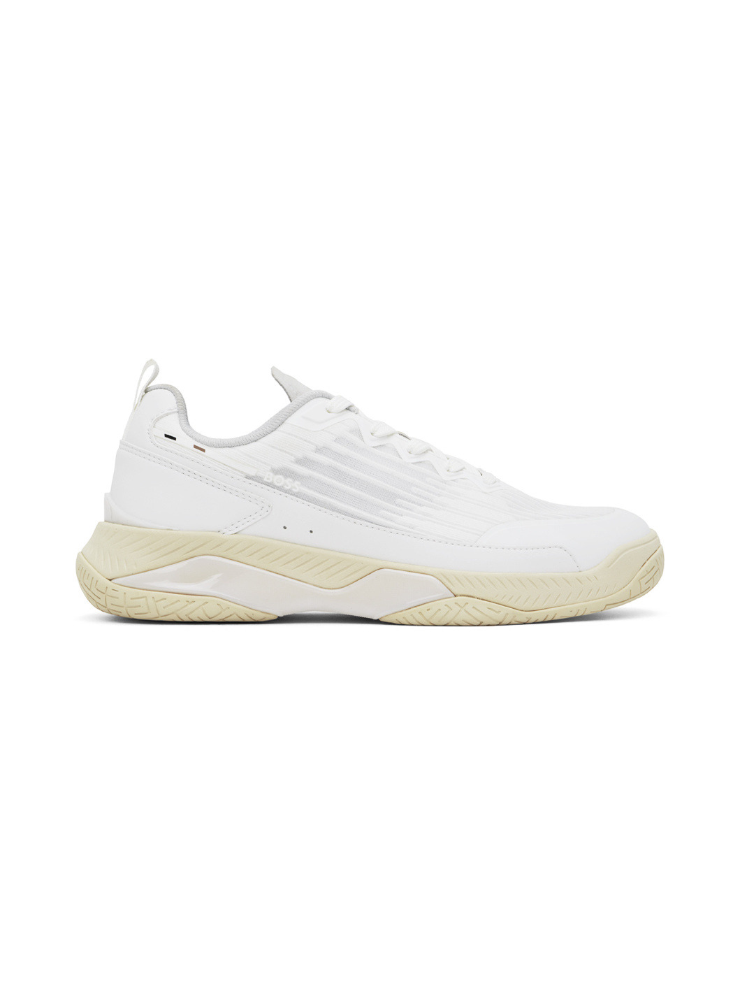 Low-top mesh, buffed faux-leather, and faux-suede sneakers in white. · Rubberized trim at toe · Lace-up closure · Logo embossed at padded tongue · Padded collar · Pull-loop at heel collar · Logo and perforated detailing at outer side · Mesh lining · Textured rubber midsole · Treaded rubber sole Supplier color: White Upper: textile, synthetic. Sole: rubber. Made in Viet Nam 242085M237012