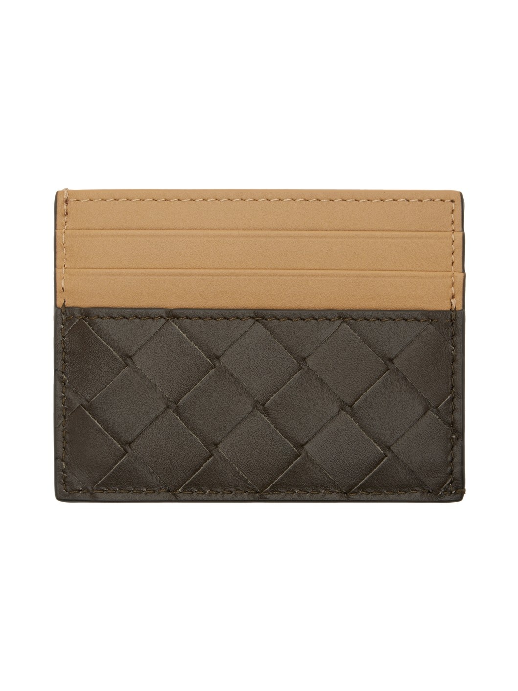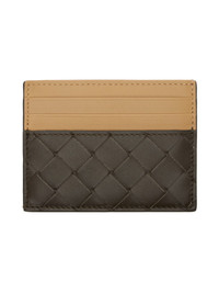 Intrecciato-woven grained calfskin card holder in beige and brown. · Burnished edges throughout · Six card slots · Central note slot · Grained calfskin lining · H3" x W4" Supplier color: Kaki/Dark praline Calfskin. Made in Italy 242798M163007