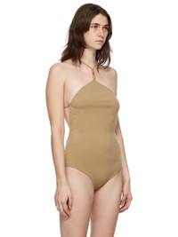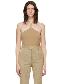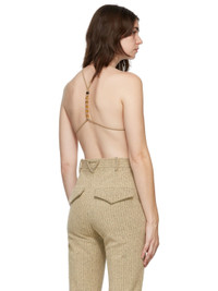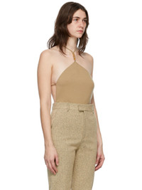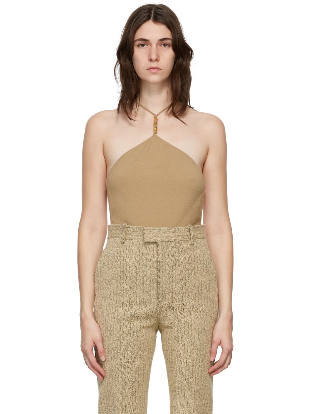 Sleeveless stretch knit cashmere-blend bodysuit in beige. Halter strap featuring beaded detailing. Open back. Press-stud closure at bottom. Brown and silver-tone hardware. Supplier color: Beige 80% cashmere, 10% polyamide, 7% polyester, 3% elastane. Made in Italy 211798F358003